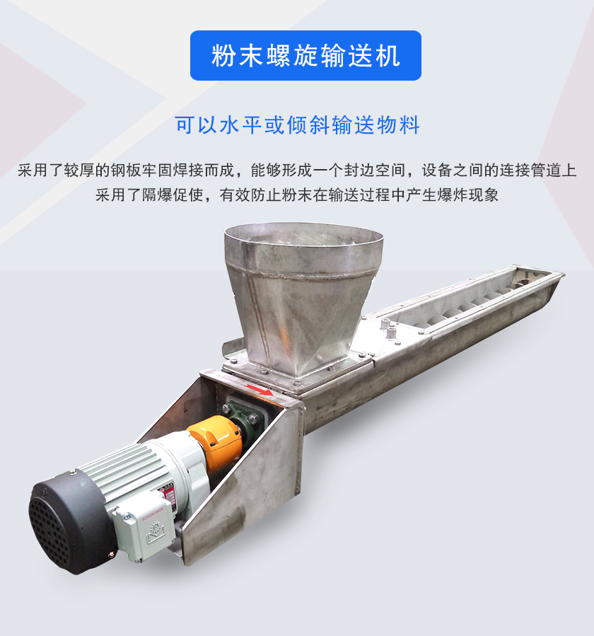 粉末螺旋输送机主要是针对粉末物料输送而设计的一种螺旋输送设备,其上下盖板采用了较厚的钢板牢固焊接而成,能够形成一个封边空间,设备之间的连接管道上采用了隔爆促使,有效防止粉末在输送过程中产生爆炸现象,还可以减少粉末在输送过程中的扬尘,避免了对输送环境的污染。粉末螺旋输送机可以水平或倾斜输送物料,根据用户输送长度的要求可采用加长设计。粉末螺旋输送机可根据输送物料特性选择碳钢或不锈钢材质。