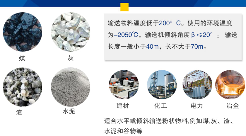 粉末螺旋输送机广泛应用于建材,化工,电力,冶金,木炭,粮食等行业。适合水平或倾斜输送粉状物料,例如煤,灰、渣、水泥和谷物等,输送物料温度低于200°C。使用的环境温度为-2050℃,输送机倾斜角度β≤20°。 输送长度一般小于40m,长不大于70m。