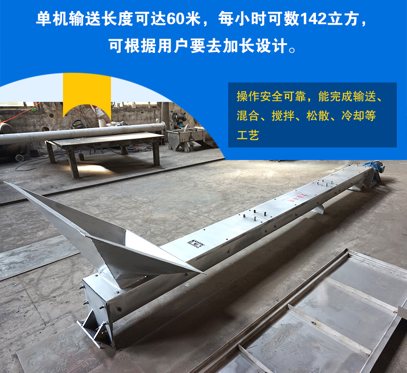 2、单机输送长度可达60米,每小时可数142立方,可根据用户要去加长设计。