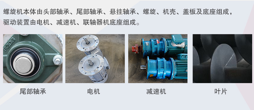 螺旋机本体由头部轴承、尾部轴承、悬挂轴承、螺旋、机壳、盖板及底座组成,驱动装置由电机、减速机、联轴器机底座组成。