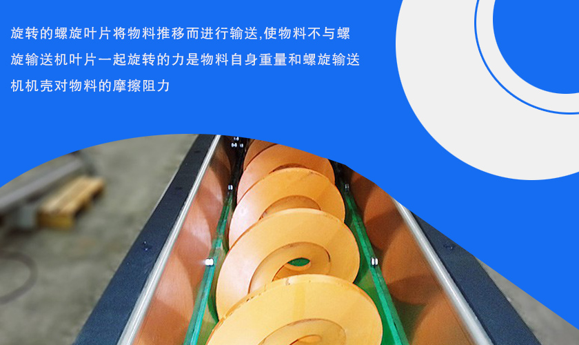 当螺旋轴转动时,由于物料的重力及其与槽体壁所产生的摩擦力,使物料只能在叶片的推送下沿着输送机的槽底向前移动,其情况好像不能旋转的螺母沿着旋转的螺杆作平移运动一样。物料在中间轴承的运移,则是依靠后面前进着的物料的推力。所以,物料在输送机中的运送,完全是一种滑移运动。为了使螺旋轴处于较为有利的受拉状态,一般都将驱动装置和卸料口安放在输送机的同一端,而把进料口尽量放在另一端的尾部附近。 旋转的螺旋叶片将物料推移而进行输送,使物料不与螺旋输送机叶片一起旋转的力是物料自身重量和螺旋输送机机壳对物料的摩擦阻力。叶片的面型根据输送物料的不同有实体面型、带式面型、叶片面型等型式。螺旋输送机的螺旋轴在物料运动方向的终端有止推轴承以随物料给螺旋的轴向反力,在机长较长时,应加中间吊挂轴承。