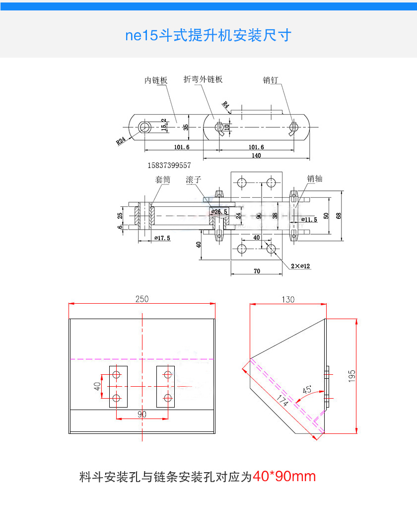 ne15斗式提升机料斗长250mm,板厚3mm,容积约2.5L,每小时提升量为15立方,ne15斗式提升机采用板式链条,耐磨性强,适合垂直提升粉状及块状物料.