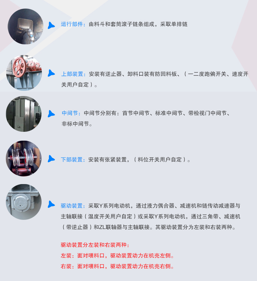 ne15斗式提升机主要由运行部件、驱动装置、上部装置、中部机壳、中部装置等部分组成。