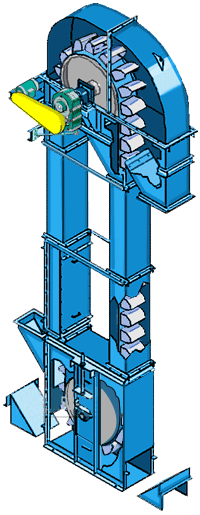 ne15斗式提升机料斗从进料口取物料,然后用链条提升到顶部,然后向下翻转,绕过顶部的轮子,物料通过斗链或提升输送机被倾倒到接受槽中,整个过程结束。