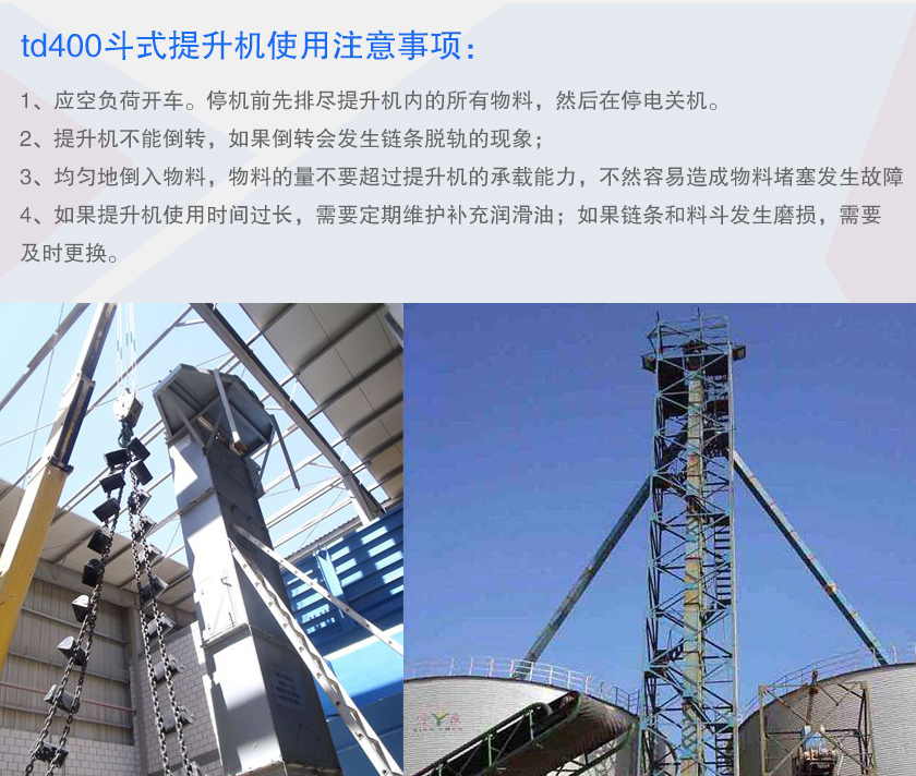 td400斗式提升机牵引件为橡胶带,斗宽为400mm,带宽为500mm,斗速为1.8m/s,提升高度达80米.提升量每小时可达24-66立方,可根据用户要求选择碳钢和不锈钢材质.