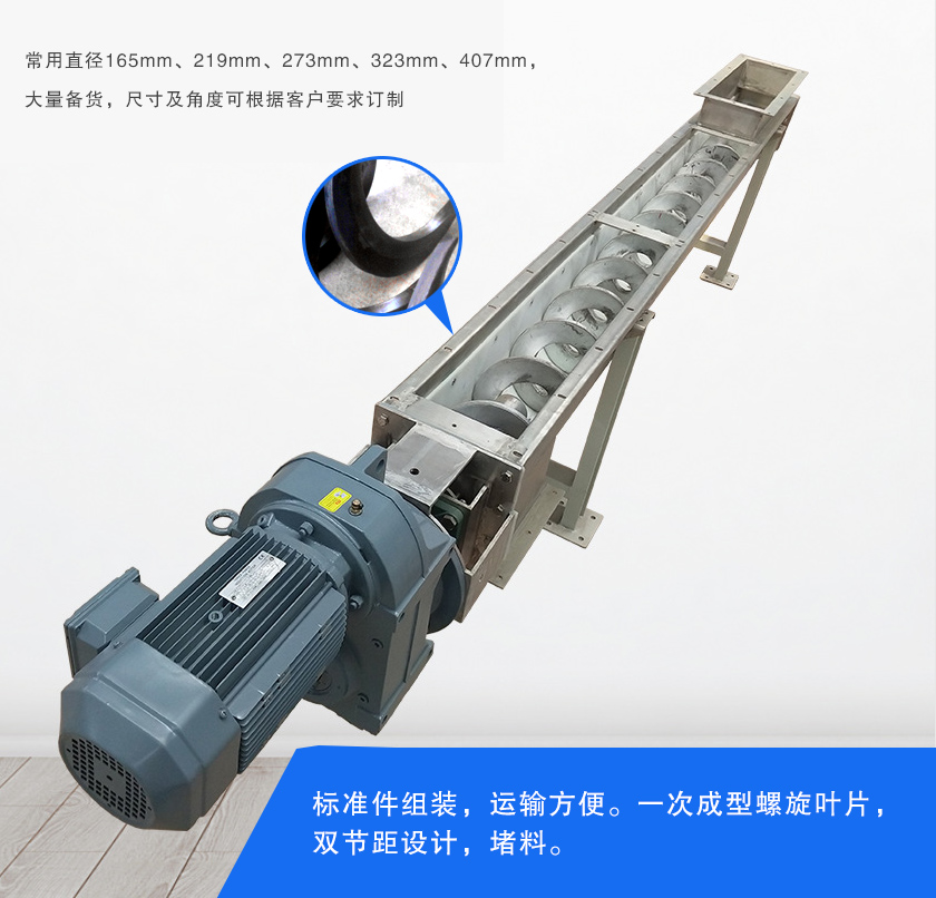 粉煤灰螺旋输送机常用直径有165mm、219mm、273mm、323mm、407mm,可选万向球连接以及软布袋连接两种连接方式,使安装调节转向方便,连接更严密。密封性好,能防止粉尘污染,可根据用户输送工艺水平或倾斜输送,组合灵活,可与多种设备配套使用。