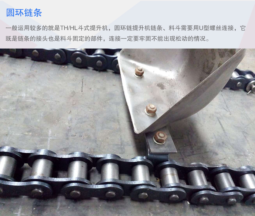 圆环链条:一般运用较多的就是TH/HL斗式提升机,圆环链提升机链条、料斗需要用U型螺丝连接,它既是链条的接头也是料斗固定的部件,连接一定要牢固不能出现松动的情况。