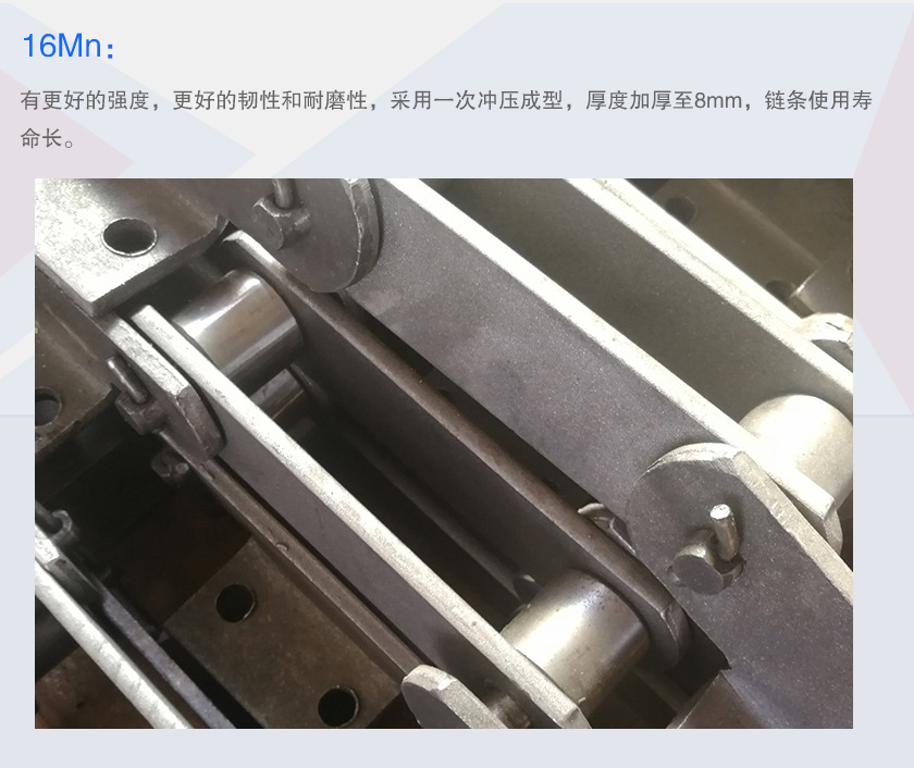 16Mn:有更好的强度,更好的韧性和耐磨性,采用一次冲压成型,厚度加厚至8mm,链条使用寿命长。
