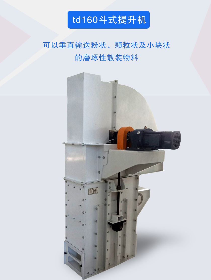 td160斗式提升机主要用于食品、化工、尖刺、冶金、煤炭等行业,适用于垂直输送粉末、颗粒、小块状或磨琢性较小的散装物料,如粮食、煤、水泥、碎矿石等物料。