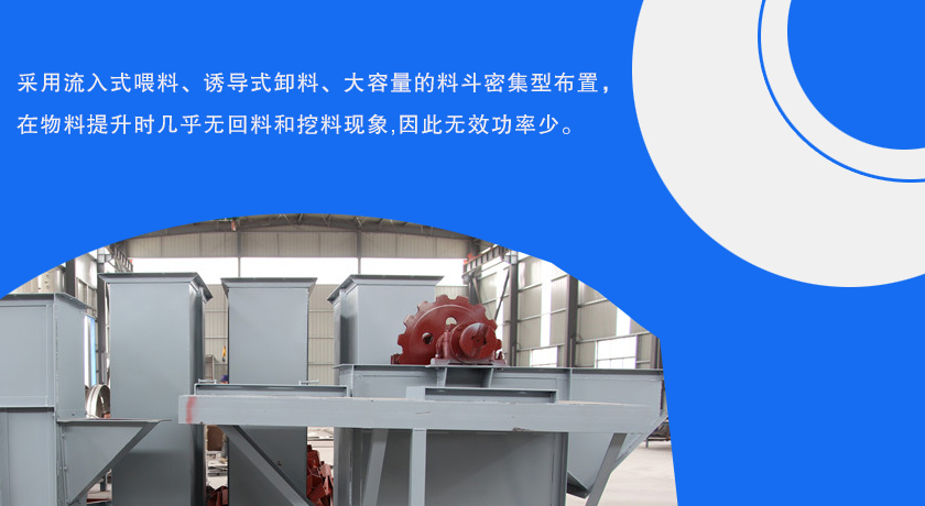 1、采用流入式喂料、诱导式卸料、大容量的料斗密集型布置,在物料提升时几乎无回料和挖料现象,因此无效功率少。