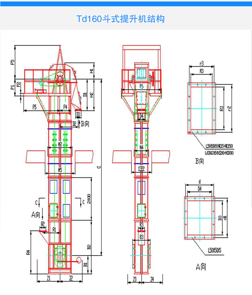 td160型斗式提升机由运行部分(料斗与牵引胶带),带有传动滚筒的上部区段,带有拉紧滚筒的下部区段、中间机壳、驱动装置、逆止制动装置等组成,