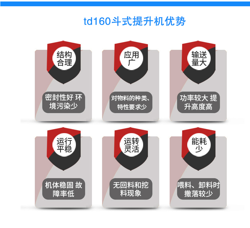 td160斗式提升机斗宽为160mm,斗速为1.4米/秒,是一种小型td斗式提升机,可以垂直输送粉状、颗粒状及小块状的磨琢性散装物料,td160型斗式提升机备有四种料斗Q型(浅斗)、H型(弧底斗)、ZD型(中深斗)SD型(深斗)。