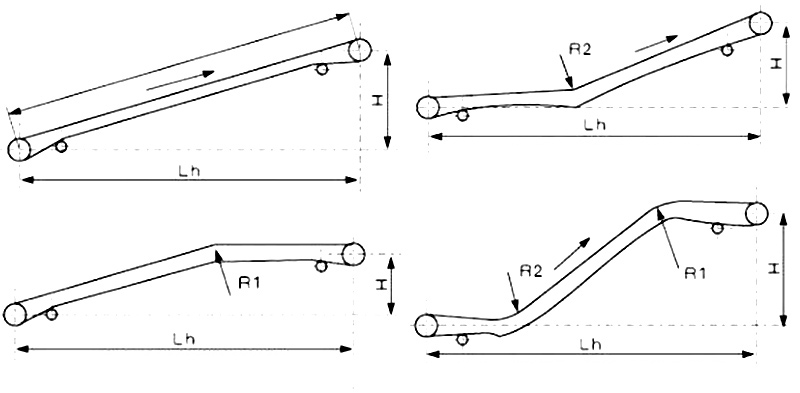 爬坡皮带输送机由上水平段、倾斜段和下水平段组成。