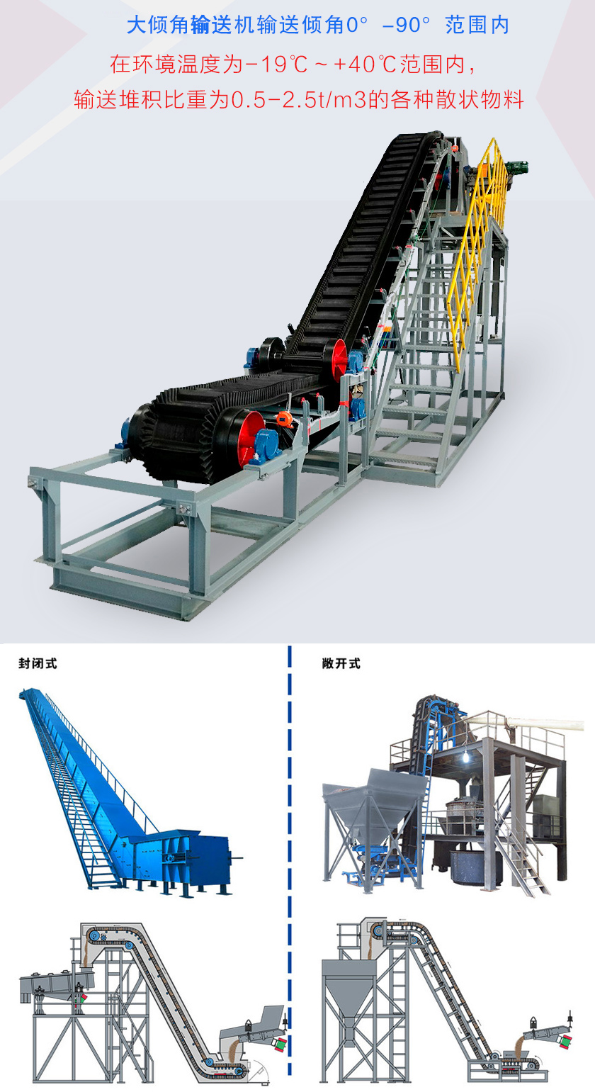 1、可大倾角输送散状物料,可节省大量设备占地面积,彻底解决普通皮带输送机无法达到的输送角度,可以30度-90度范围内输送。