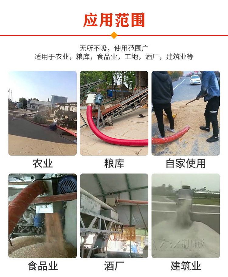 吸粮机是农场吸粮、抽粮的好帮手,适合粮食运输、装载、堆垛、储存等,长度3-30米,每小时可输送20吨粮食,它可以水平、倾斜或垂直输送谷物。粮食垂直输送时,每小时输送量可达6吨。