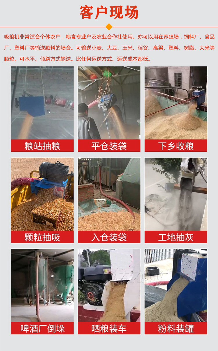 吸粮机可水平、斜向、垂直输送物料,单机独立完成输送任务。