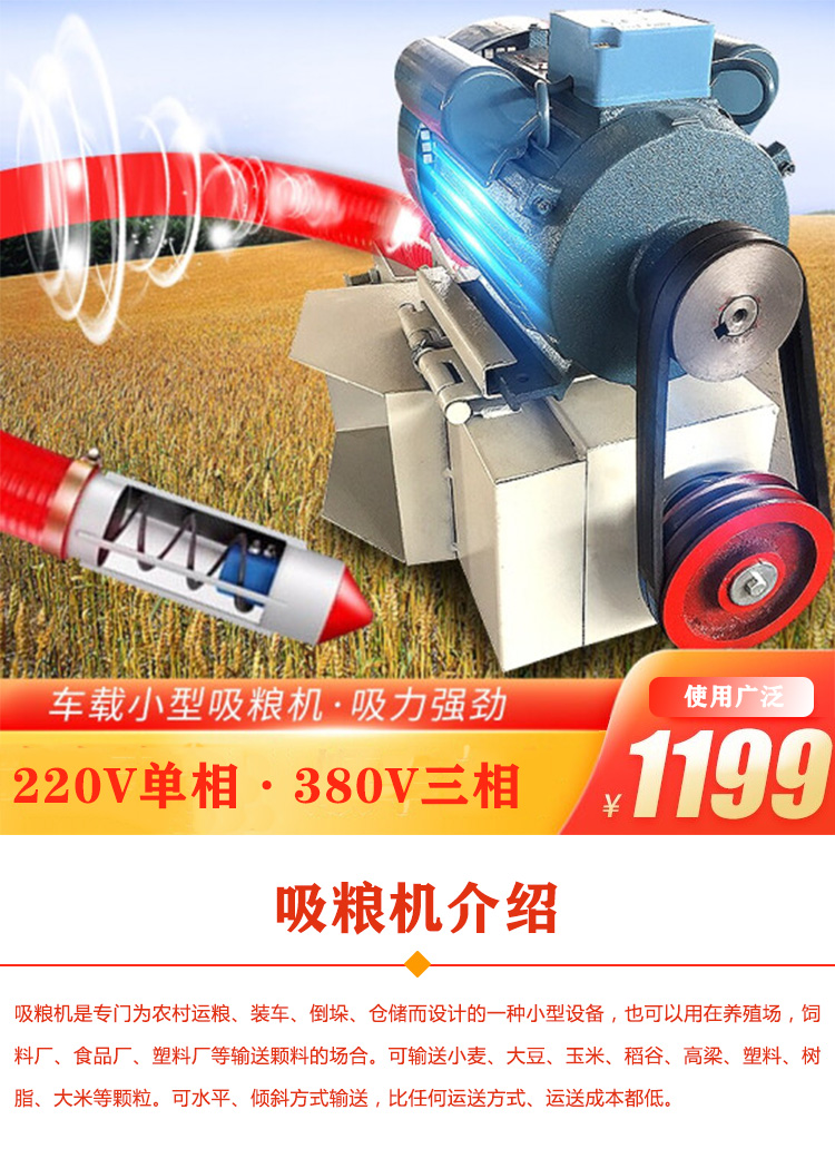 吸粮机是一种通过管道输送散装谷物的设备。它的主要功能是将谷物从一个设备运输到另一个设备,常见的一种是将地面上的散粮运输到卡车上,将卡车上的散粮运输到粮库,将颗粒状物料运输到抛光机等设备上。本文将详细为您讲解吸粮机的工作原理及用途。