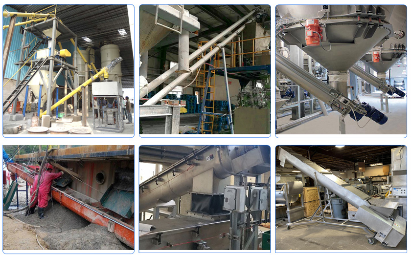 上面是不同类型的倾斜螺旋输送机的输送角度,下面展示不同角度的倾斜螺旋输送机的现场图片: