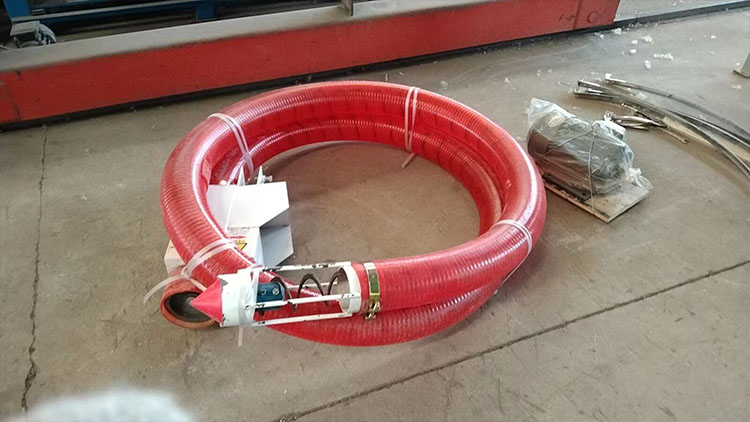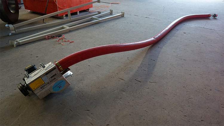 100毫米柔性螺旋输送机工作时,机器的进料口插入待输送物料的堆放处,通过电机驱动使柔性管道内的弹簧叶片旋转产生向前的推力,使物料沿着密封管道向前移动直至出料口位置排出。