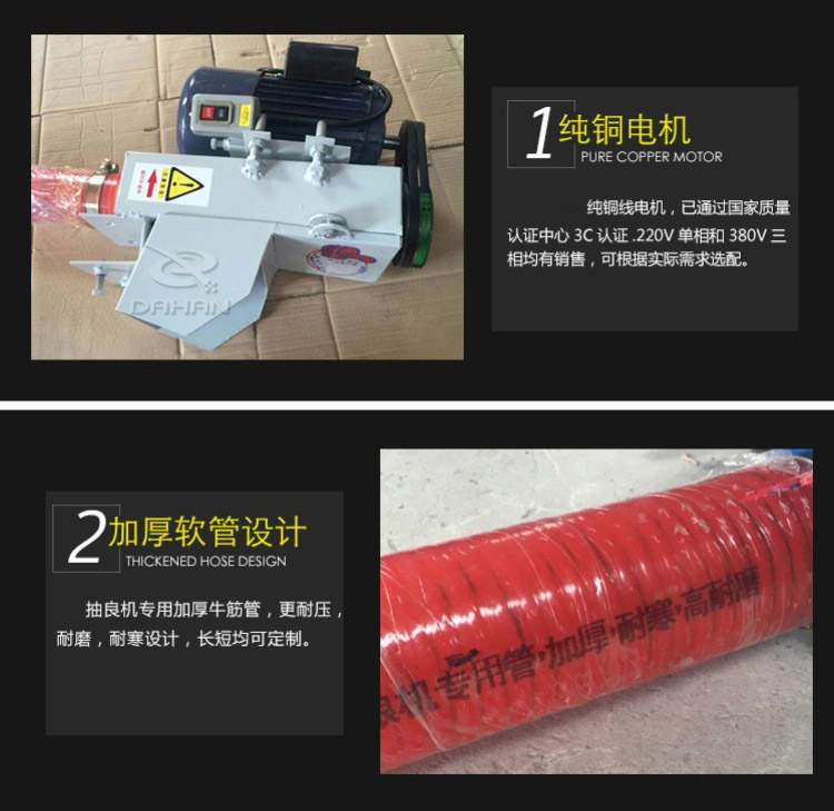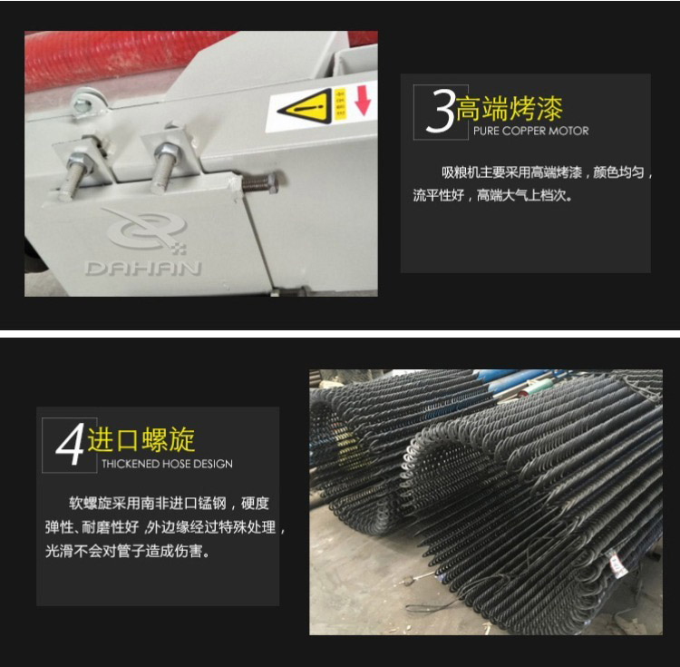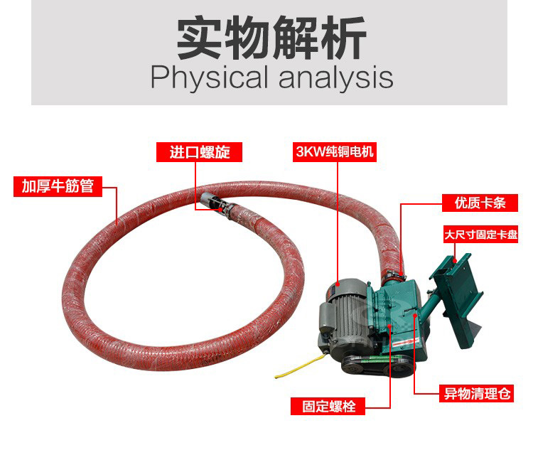 粮食的收购入车的操作,该绞龙具有省时、省力、省人工的功效。而且重量轻,有两个人操作可以了,加进了粮食收购过程,大大节省了时间,受到了广大粮食收购者的欢迎!粮食用吸粮机机:便捷式抽粮器,本机器具有体积小、功率大、携带方便等特点,全国少见生产新型产品。机器使用电源220V(两相电可操作),机身长度8米,每小时抽粮10-12吨,机器重量75公斤,适合下乡抽粮使用,能使您减轻人工负担。省工省时省力,下乡抽粮神器。使用220V电压和380V电压两种,简单实用,设计合理,体积小,每小时提升6吨粮食,直接卡在货车箱的加高壁上就可以了,可弯曲可移动,可分体,携带方便,是各种粮食作物装车、卸车、出库、入库等的好设备,即省工又省力