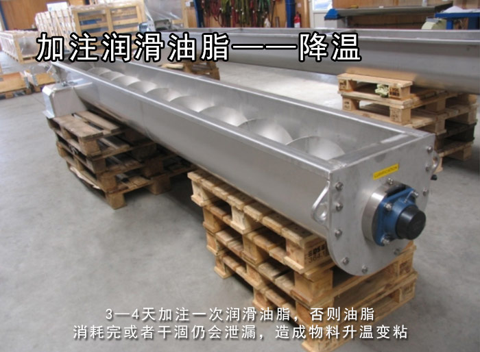 有些物料在温度达到一定程度时会改变性质变得有粘性,这是因为物料与螺旋叶片和螺旋管壁的摩擦会产生一定的温升,螺旋传动轴头也会在工作过程中产生一定温度,如果因为升温而变的有粘性,势必会造成螺旋输送机不能正常工作,所以要有正确的处理方法就是一般主要依靠加注油润滑而对螺旋输送机的内部进行降温。