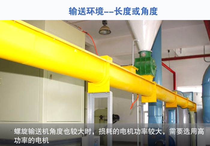 长度超过15米,管壁厚度必须在10-15mm;角度大于30度,选用高功率电机。输送环境决定了螺旋输送机的长度和连接方式,输送长度较大时,要求螺旋输送机管壁的厚度必须要在10-15mm,否则螺旋输送机容易断裂。螺旋输送机角度也较大时,损耗的电机功率较大,需要选用高功率的电机。