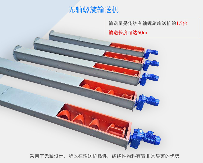总结:无轴螺旋输送机由于采用无轴设计,所以具备抗缠绕性,在输送带状,粘性物料具备优势。其扭矩可达4000N/m,输送量是传统有轴螺旋输送机的1.5倍,输送长度可达60m,输送效果尤为显著。