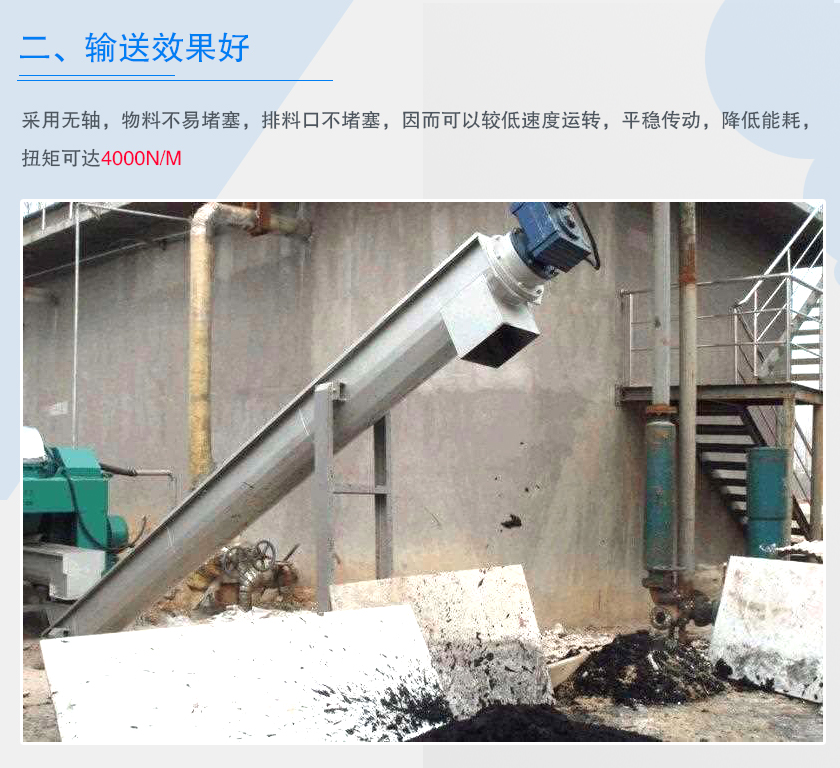 无轴螺旋输送机由于采用无轴,物料不易堵塞,排料口不堵塞,因而可以较低速度运转,平稳传动,降低能耗,扭矩可达4000N/m,输送量是相同直径传统有轴螺旋输送机的1.5倍,单机输送长度可达60米。并可根据用户需要,采用多级串联式安装。