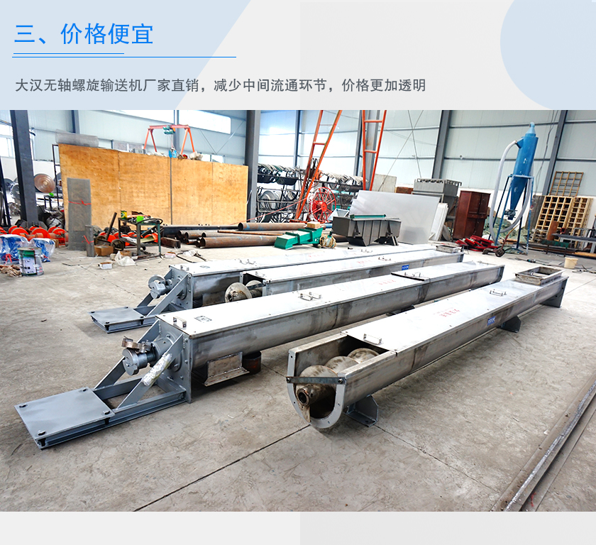 大汉无轴螺旋输送机厂家直销,减少中间流通环节,价格更加透明,厂家位于河南省新乡市,生产成本较北京、上海等地会更加便宜,所以无轴螺旋输送机价格也会更低。