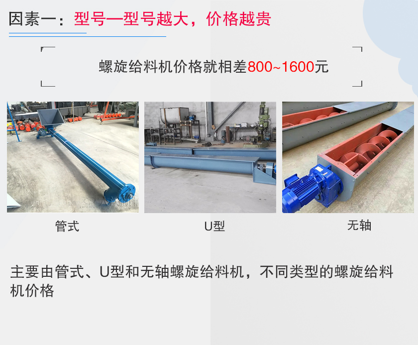 螺旋给料机主要由管式、U型和无轴螺旋给料机,不同类型的螺旋给料机价格是不一样的,而对于同一类型的螺旋给料机,螺旋管径越大,其输送量就越大,但是价格也会相应有所增加。以大汉公司为例,在相同类型、设计、材质的情况下,每相差一个型号,螺旋给料机价格就相差800~1600元。