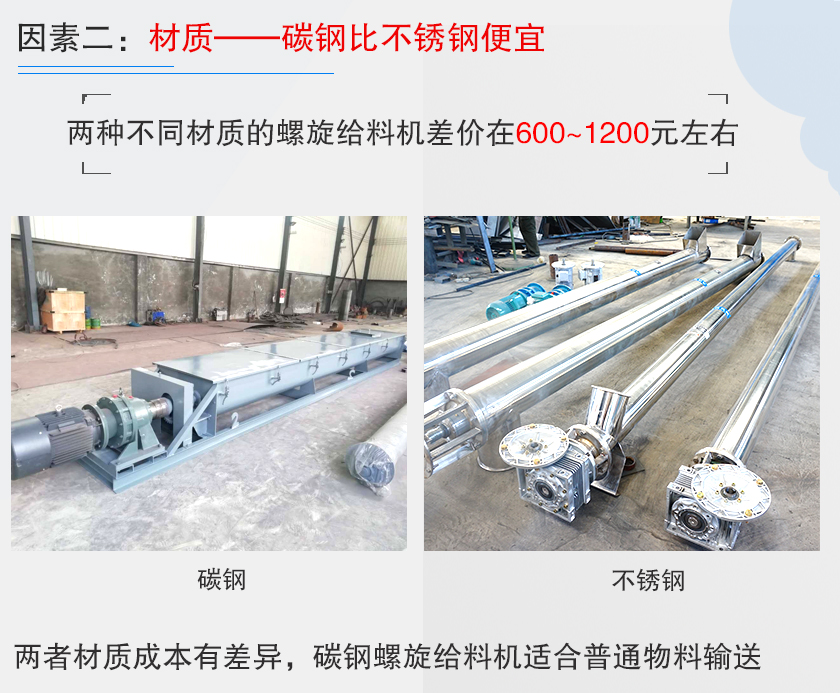 螺旋给料机可以分为碳钢和不锈钢材质两种,由于这两者材质成本有差异,碳钢螺旋给料机适合普通物料输送,不锈钢螺旋给料机主要用于输送机食品、医药等对输送环境有卫生标准的行业,碳钢材质会比不锈钢材质成本低,这两种不同材质的螺旋给料机差价在600~1200元左右。