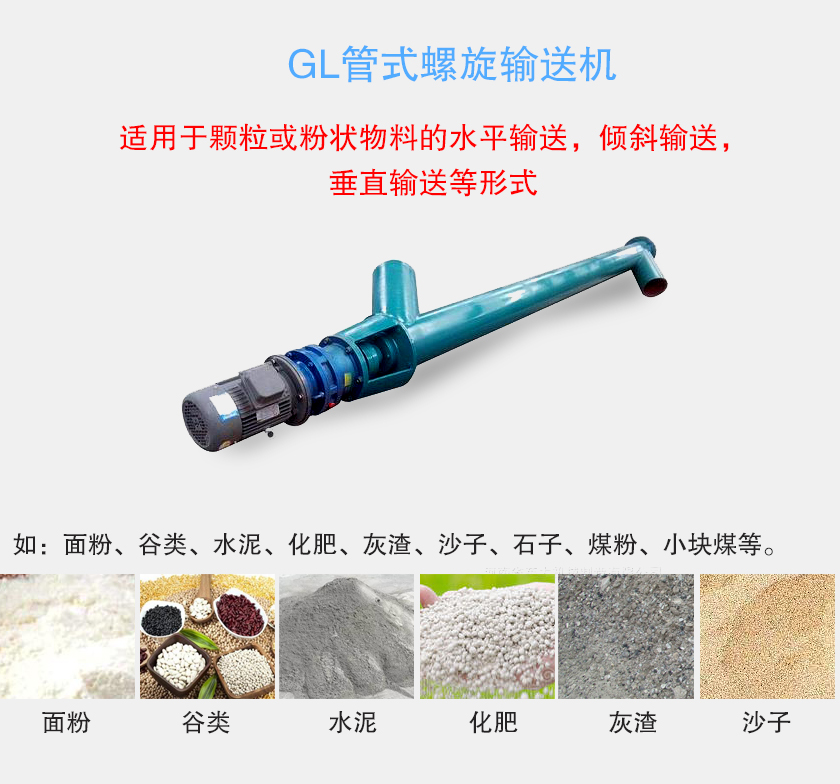 GL管式螺旋输送机适用于颗?;蚍圩次锪系乃绞渌停阈笔渌停怪笔渌偷刃问?,如:面粉、谷类、水泥、化肥、灰渣、沙子、石子、煤粉、小块煤等。