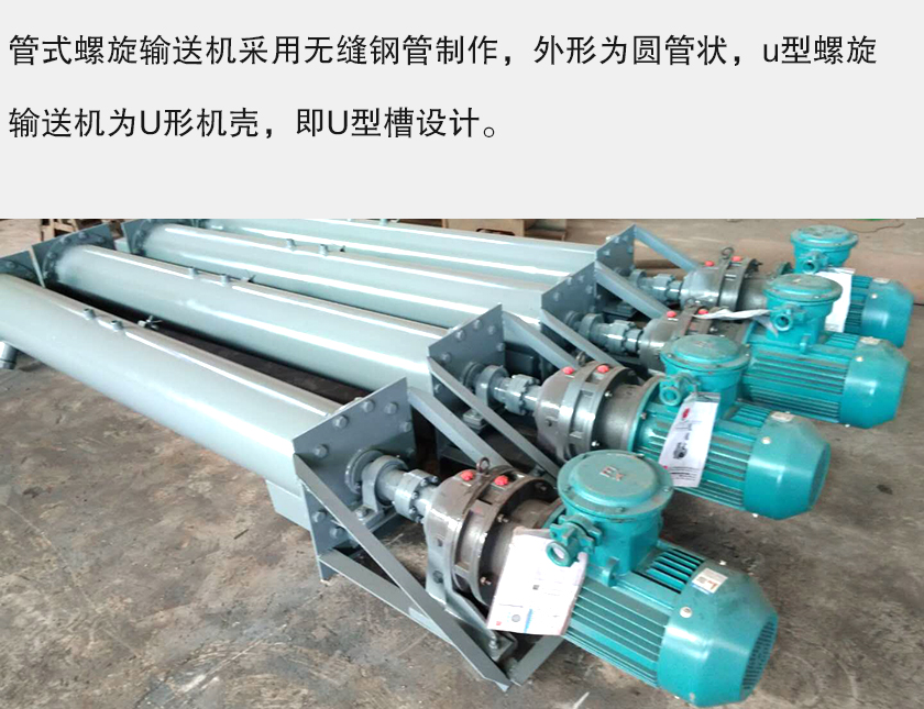 管式螺旋输送机采用无缝钢管制作,外形为圆管状,u型螺旋输送机为U形机壳,即U型槽设计。