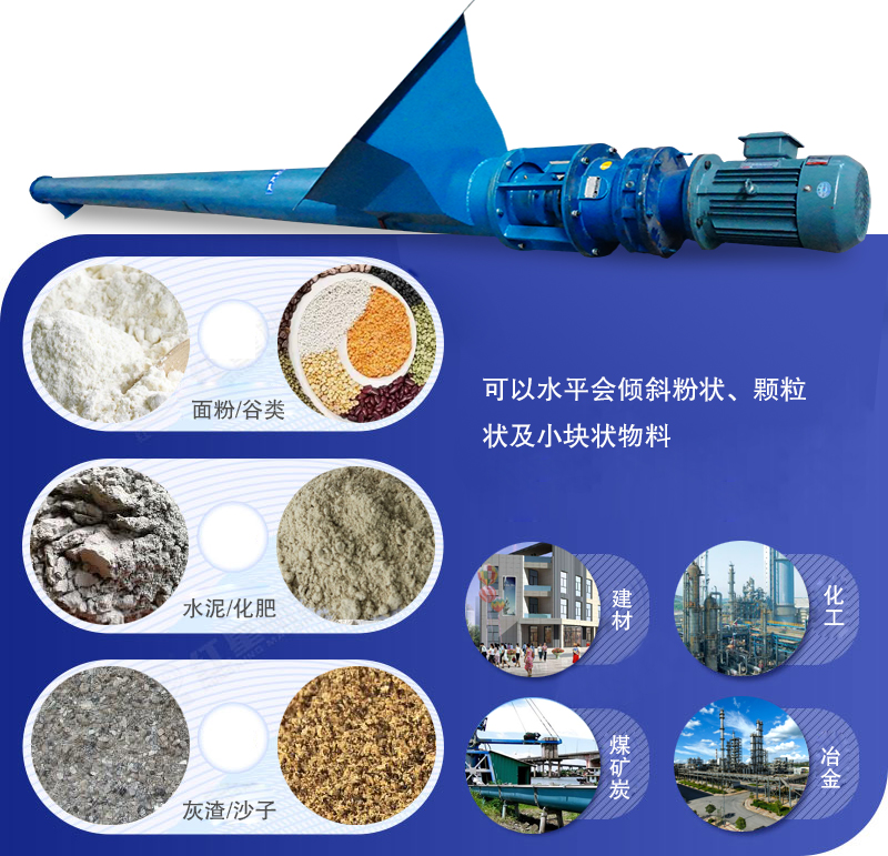 管式螺旋输送机可以水平会倾斜粉状、颗粒状及小块状物料,如输送面粉、谷类、水泥、化肥、灰渣、沙子、石子、煤粉、小块煤等物料。